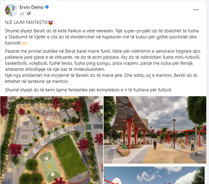 Shumë shpejt Berati do të ketë Parkun e vetë rekreativ. Një super-projekt do të zbatohet te fusha e Stadiumit të Vjetër e cila do të shndërrohet në hapësirën më të bukur për gjithë sportistët dhe banorët. |