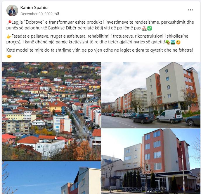 Fasadat e pallateve, rrugët e asfaltuara, rehabilitimi i trotuareve, rikonstruksioni i shkollës(në proçes), i kanë dhënë një pamje krejtësisht të re dhe tjetër gjallëri hyrjes së qytetit! Këtë model të mirë do ta shtrijmë vitin që po vjen edhe në lagjet e tjera të qytetit dhe në fshatra!