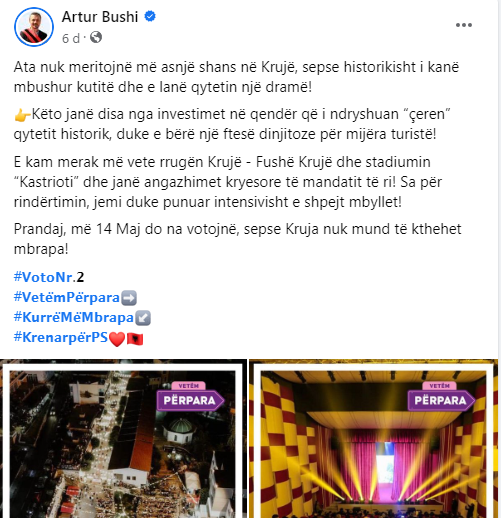 | 08/05/2023 | "Nuk na mjafton vetëm shkolla e re, por nisim tani shpejt asfaltimin e rrugës në këtë fshat! Kaluam një mandat sprove me rindërtimin, e tani fokusi do të jetë infrastruktura edhe në Malësinë e Krujës!"